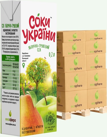 Склад: підготовлена артезіанська вода, натуральний концентрований яблучний сік (76,1 %)*, натуральне яблучне пюре (18,6 %), натуральне грушеве пюре (5,3 %).